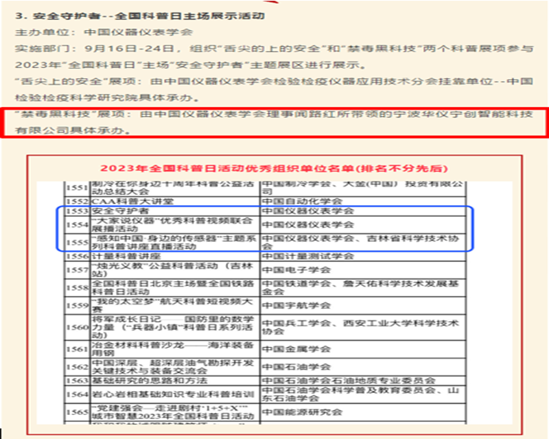 一封來自中國科協(xié)的感謝信 2023-12-28 作為公共安全禁毒科技創(chuàng)新成果轉(zhuǎn)化優(yōu)秀企業(yè)代表,寧波華儀寧創(chuàng)智能科技有限公司在中國科協(xié)的帶領(lǐng)下,助力中國儀器儀表學(xué)會在北京首鋼園參加2023全國科普日。此次活動,華儀寧創(chuàng)在“安全守護者——禁毒黑科技”展區(qū)承擔(dān)禁毒科普教育任務(wù),以毛發(fā)毒品快速篩查質(zhì)譜儀、便攜式毒品檢測一體機、手機APP驗毒套件、仿真毒品模型為主要展出形式,面向全國青少年進行禁毒科技展示。此次科普日活動觀眾量近5萬人次,華儀寧創(chuàng)接待觀眾近2萬,現(xiàn)場反響異常熱烈。許多學(xué)生和家長結(jié)束參觀后,在現(xiàn)場媒體的采訪中都會介紹到,在參觀途中令自己印象最深刻的… 查看詳情