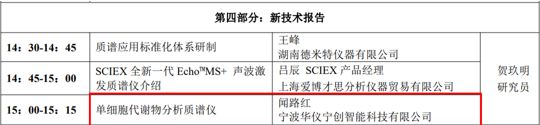3月22日,會議報告如期召開。寧波大學教授、華儀寧創(chuàng)總經理聞路紅受邀出席新技術報告會議,并在現(xiàn)場作《單細胞代謝物分析質譜儀》主題報告。聞路紅教授在報告中向現(xiàn)場觀眾詳細介紹了華儀寧創(chuàng)基于原創(chuàng)質譜技術研發(fā)推出的國產單細胞質譜儀SinCell-100,并在后續(xù)報告中圍繞單細胞質譜儀的主要應用領域以及目前已突破的關鍵技術點進行講解。報告最后,聞路紅教授針對現(xiàn)場觀眾所提出的問題逐一進行解答,報告現(xiàn)場反響異常熱烈。