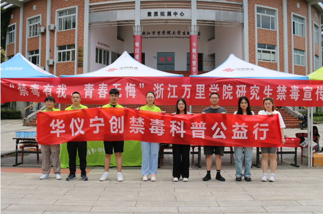 活動結(jié)束后,華儀寧創(chuàng)禁毒科普公益小分隊與浙江萬里學(xué)院的志愿者們進(jìn)行合影留念。