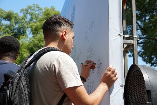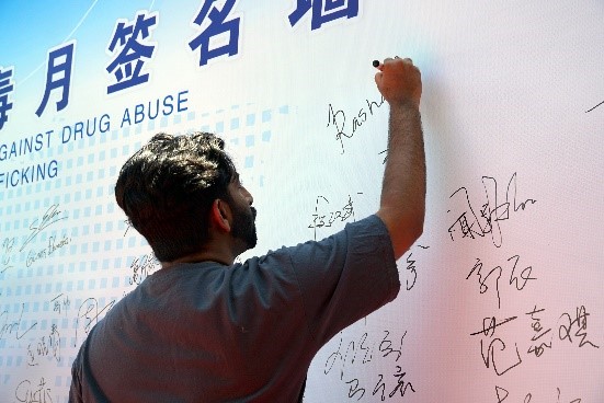 在各位領(lǐng)導(dǎo)嘉賓的帶領(lǐng)下,參加活動的老師和同學(xué)們紛紛在“禁毒月簽名墻上”留名,對自己堅決抵制毒品、建設(shè)無毒社會留下莊嚴(yán)承諾。
