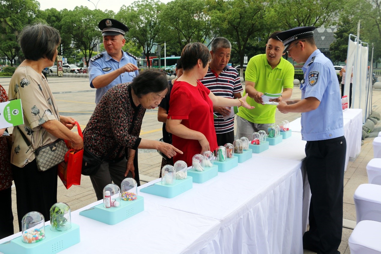 6月24日上午,在鄞州區(qū)明州里商場門前,一場題為“共建無毒家園,守護紅色根脈”的禁毒科普公益行活動熱烈展開。本次活動由鄞州區(qū)禁毒委員會辦公室、鄞州區(qū)科學技術(shù)協(xié)會、鐘公廟街道、寧波海警局鄞州工作站、寧波華儀寧創(chuàng)智能科技有限公司等單位聯(lián)合舉辦,包括仿真毒品展示、禁毒常識宣講、海上緝毒分享、禁毒知識有獎問答、禁毒檢測儀器體驗等多個豐富多彩的內(nèi)容。鄞州區(qū)禁毒辦常務(wù)副主任、區(qū)公安分局禁毒大隊大隊長葉仁達、鄞州區(qū)公安分局禁毒大隊教導員林蕓、寧波海警局鄞州工作站教導員朱文陸、鐘公廟街道社會治安綜合治理辦公室主任、街道禁毒辦主任沈衛(wèi)民、寧波華儀寧創(chuàng)智能科技有限公司總經(jīng)理聞路紅等領(lǐng)導以及警民代表300余人參加了現(xiàn)場活動。