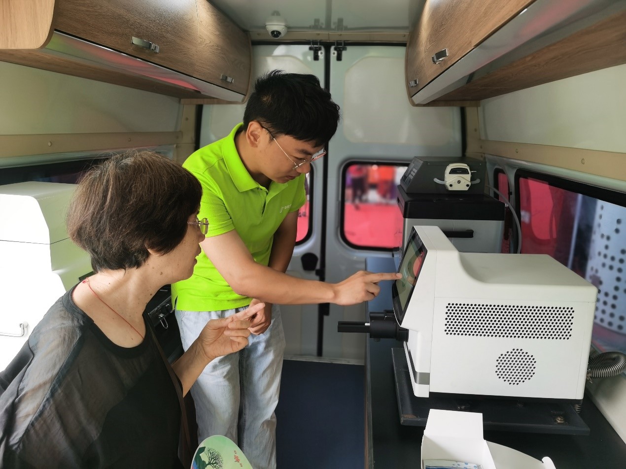 市民朋友登上毒品防控移動實驗室,一鍵操作儀器,體驗唾液中毒品檢測