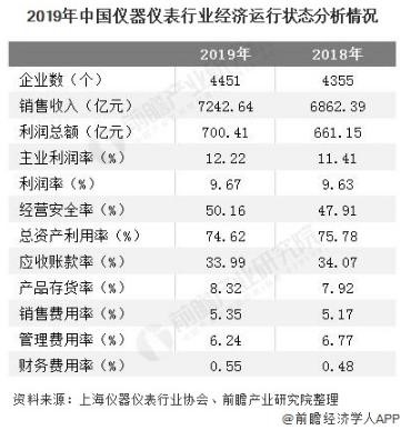 2019年儀器儀表行業(yè)除了總資產(chǎn)利用率、產(chǎn)品存貨率、銷售費(fèi)用率和財(cái)務(wù)費(fèi)用率四個(gè)較2018年同期有所下降外,其余指標(biāo)均實(shí)現(xiàn)了增長(zhǎng)。其中2019年儀器儀表行業(yè)實(shí)現(xiàn)銷售收入7242.64億元,同比增長(zhǎng)5.54%;實(shí)現(xiàn)利潤(rùn)總額700.41億元,同比增長(zhǎng)5.94%??傮w來看,儀器儀表行業(yè)運(yùn)行情況較為穩(wěn)定。