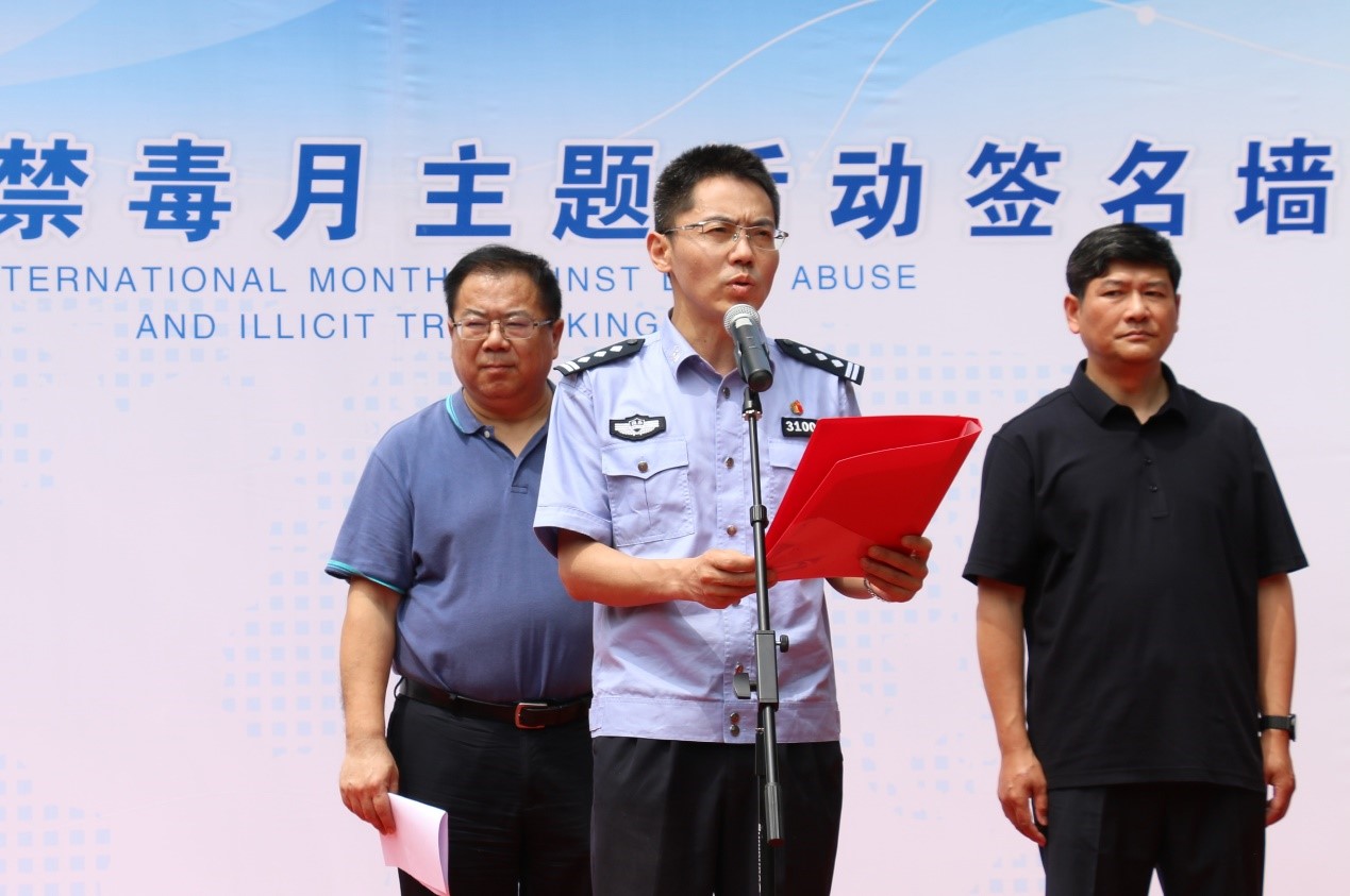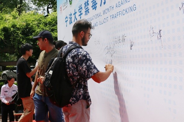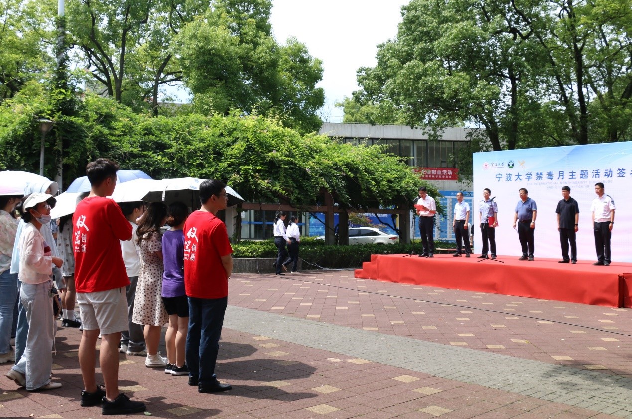 本次活動中,寧波大學副校長汪浩瀚,寧波市禁毒辦副主任徐瑋,寧波市海關(guān)緝私局辦公室副主任、二級高級警長侯長龍,寧波市江北區(qū)禁毒辦主任、公安分局黨委委員、副局長葉利民蒞臨到場?;顒右参私?span>300余位寧波大學師生特別是寧波大學的留學生共同參加。