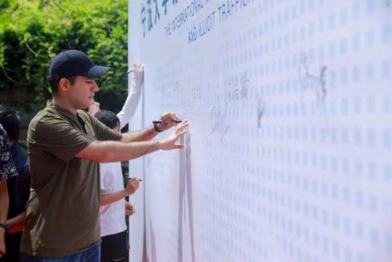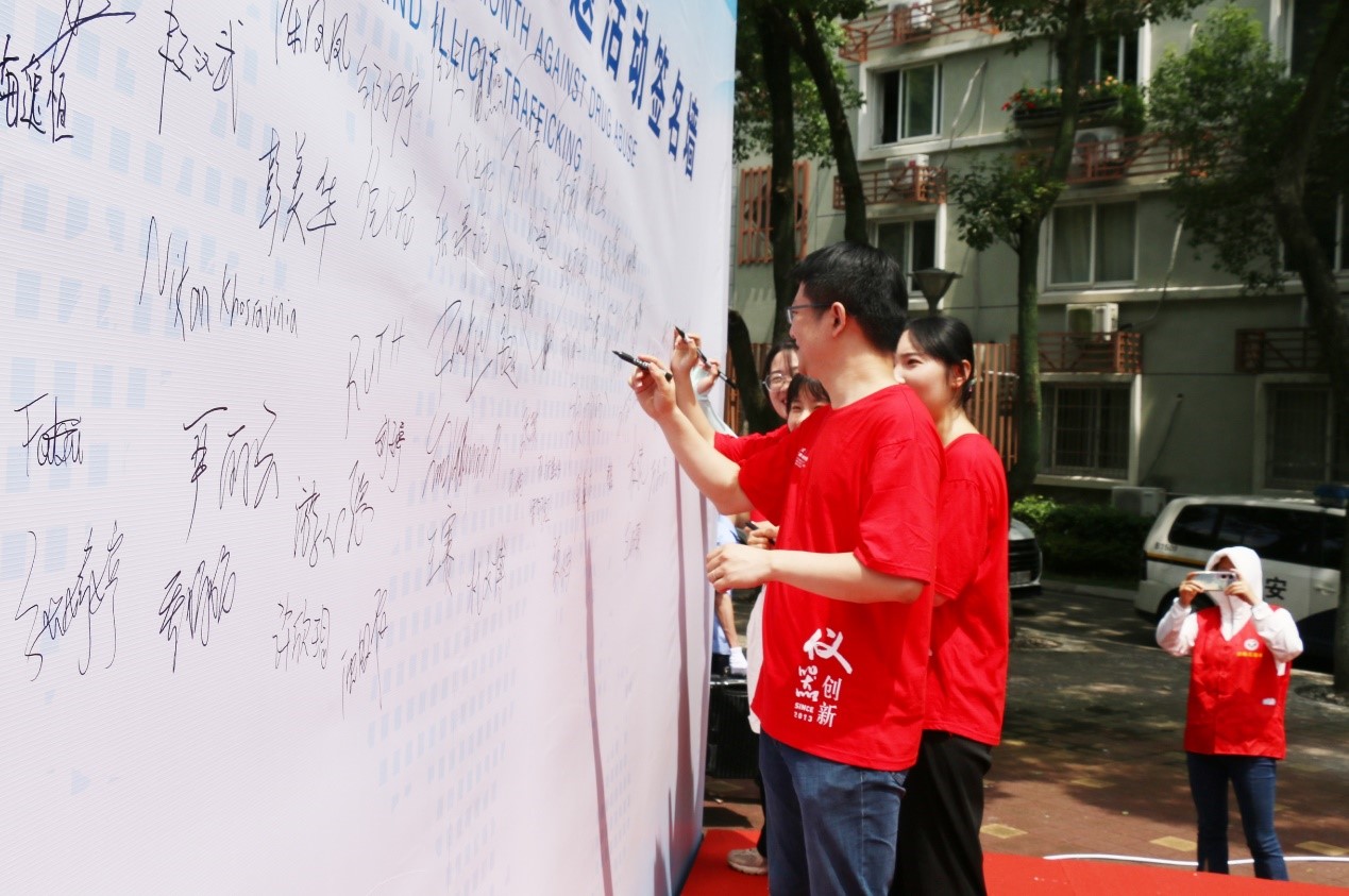 在各位領(lǐng)導(dǎo)嘉賓的帶領(lǐng)下,參加活動的老師和同學們紛紛在“禁毒月簽名墻上”留名,對自己堅決抵制毒品、建設(shè)無毒社會留下莊嚴承諾。