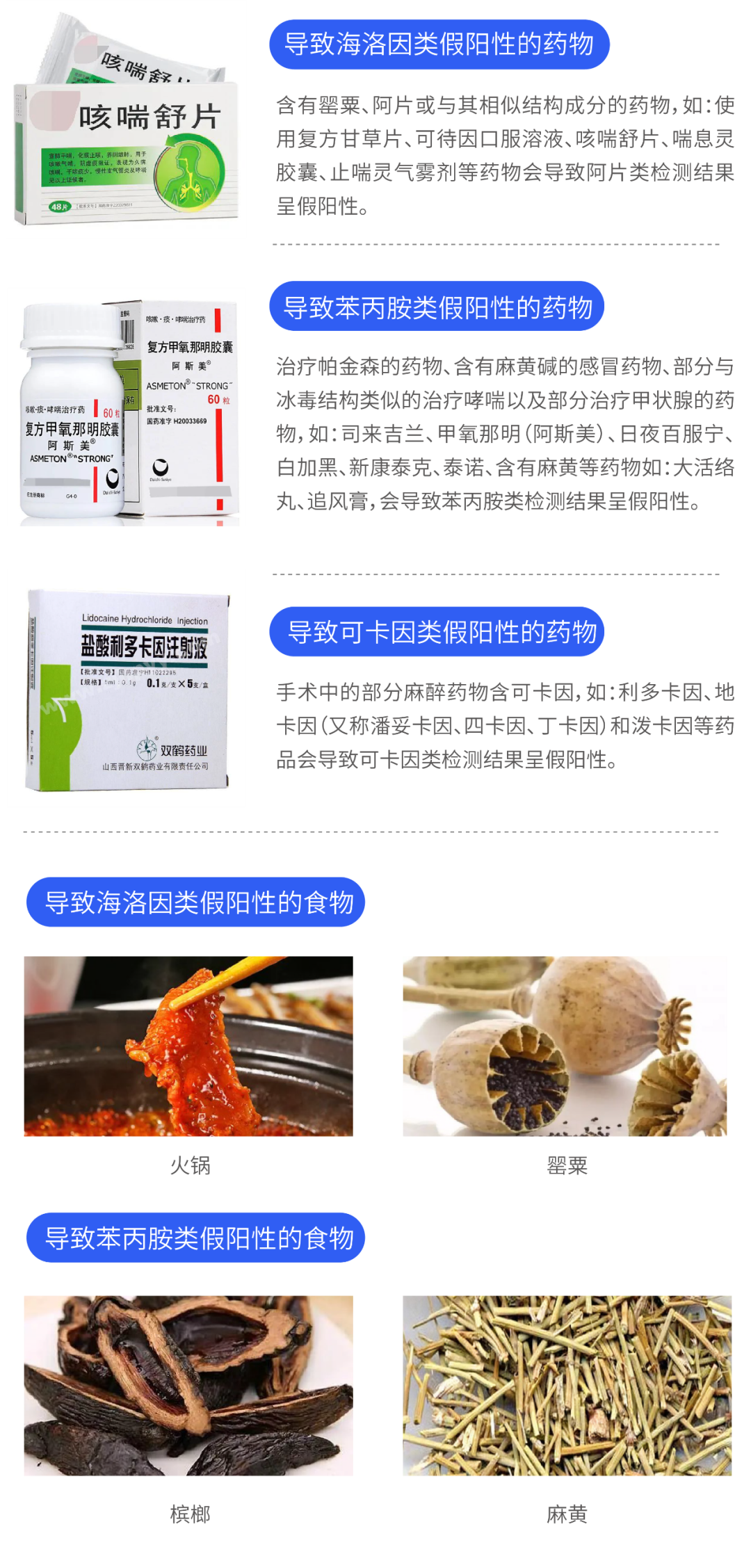 攝入不法分子添加罌粟殼等違禁物質(zhì)的食物;一些藥物或食物中的某些物質(zhì),其化學(xué)結(jié)構(gòu)或代謝物的核心結(jié)構(gòu)與毒品結(jié)構(gòu)相同或類(lèi)似,直接影響快速篩查結(jié)果。